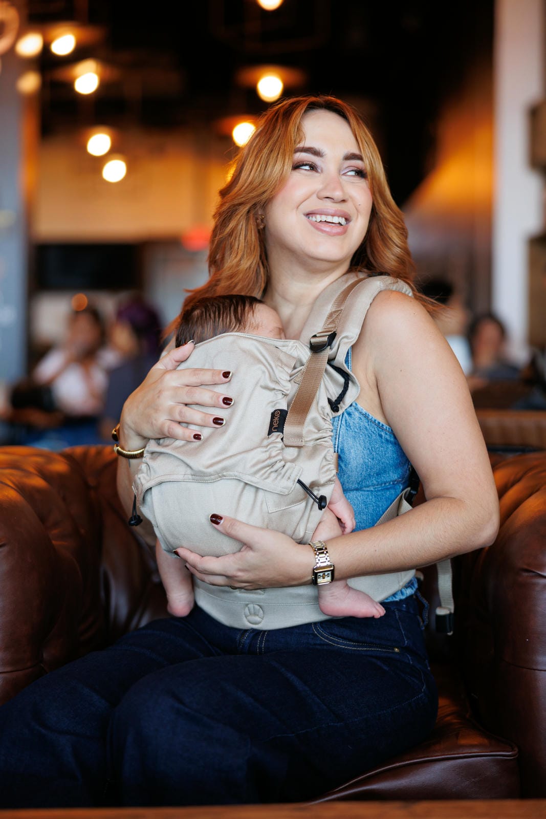 Desde los primeros días de vida, este portabebés asegura una posición segura. Al llevar al bebé pegado al pecho, se previene la compresión del mentón hacia el pecho, favoreciendo una respiración saludable. Los cordones laterales y los reguladores del panel permiten ajustarlo con precisión según la etapa de desarrollo del bebé.
