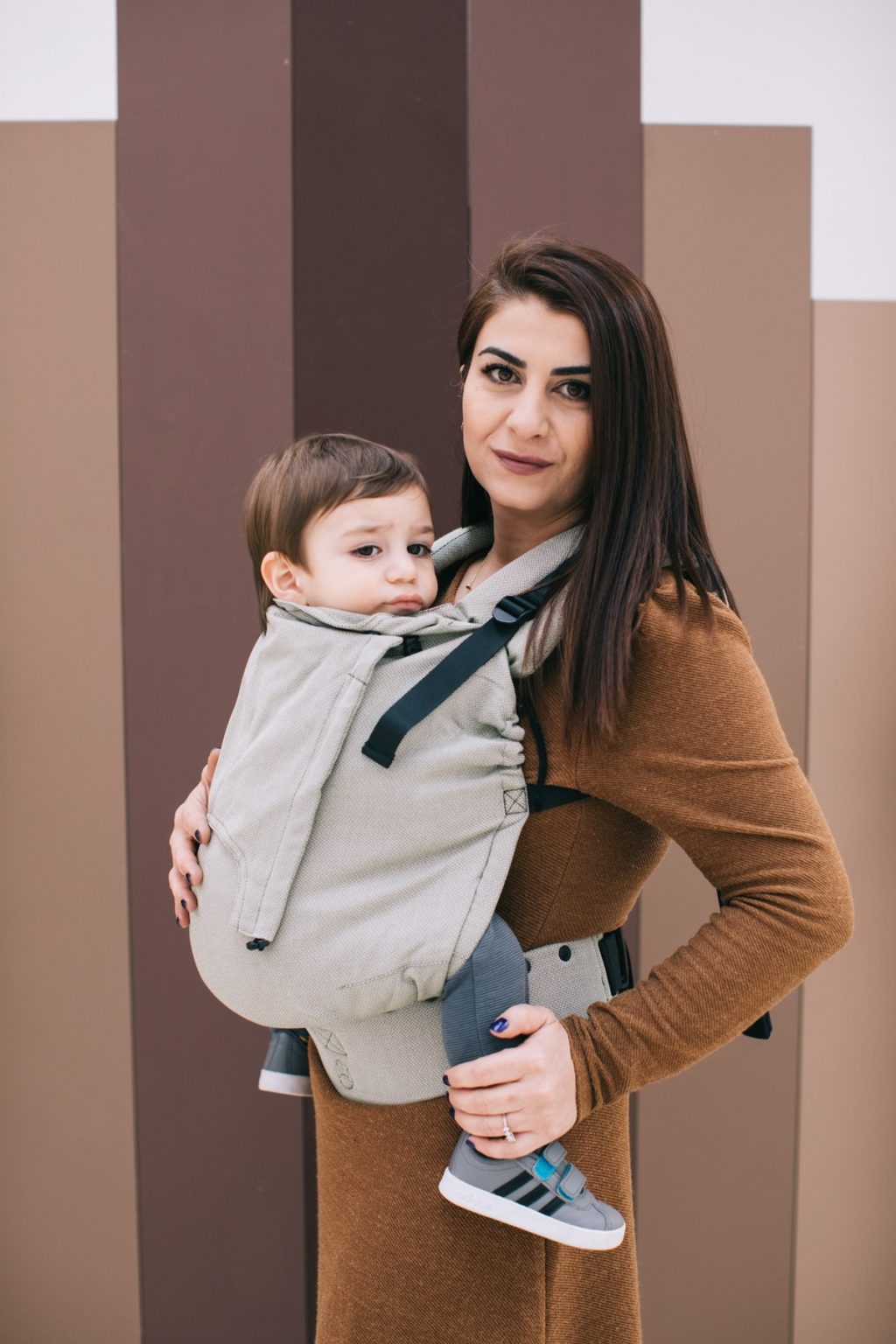 Desde los primeros días de vida, este portabebés asegura una posición segura. Al llevar al bebé pegado al pecho, se previene la compresión del mentón hacia el pecho, favoreciendo una respiración saludable. Los cordones laterales y los reguladores del panel permiten ajustarlo con precisión según la etapa de desarrollo del bebé.